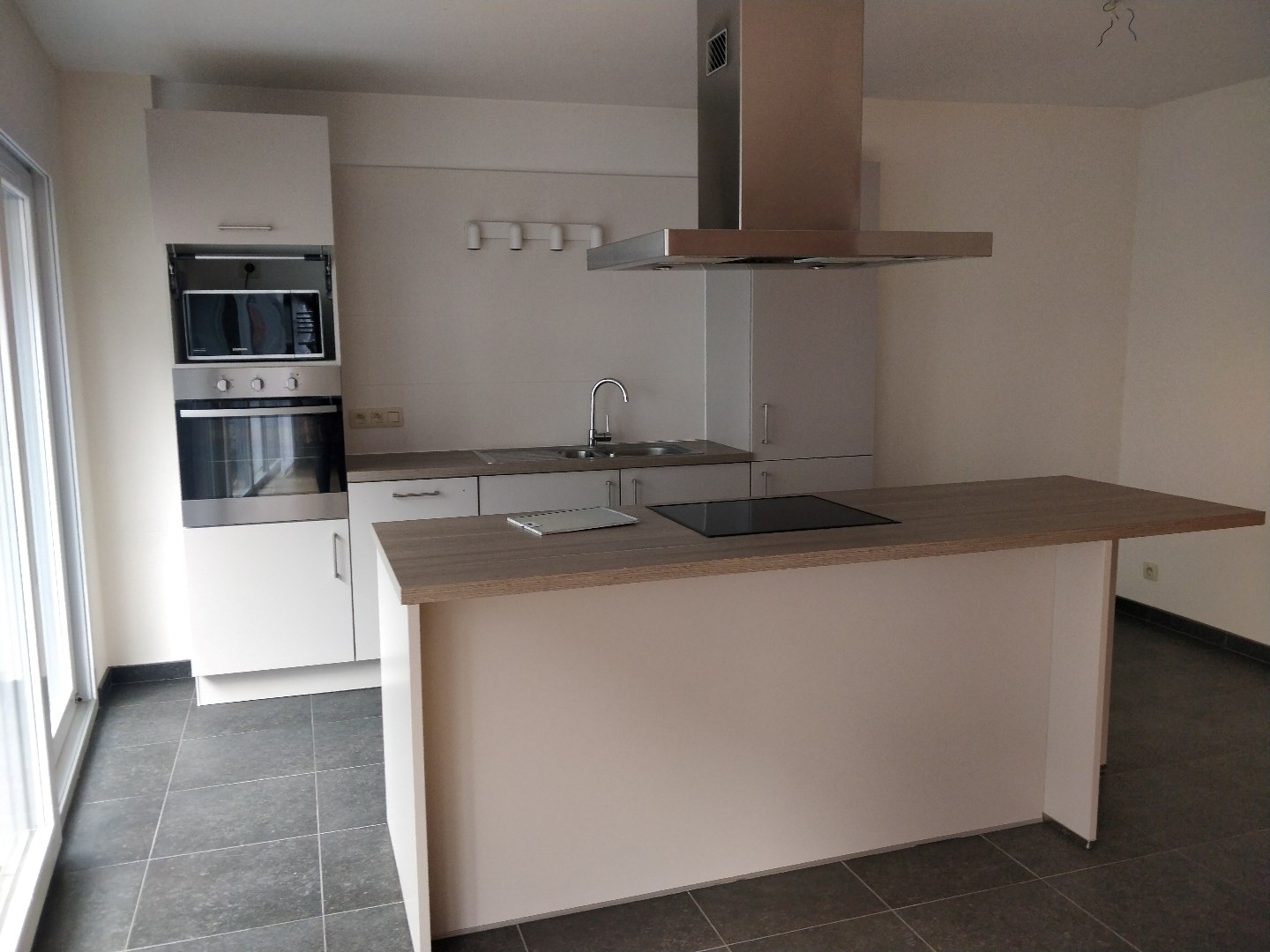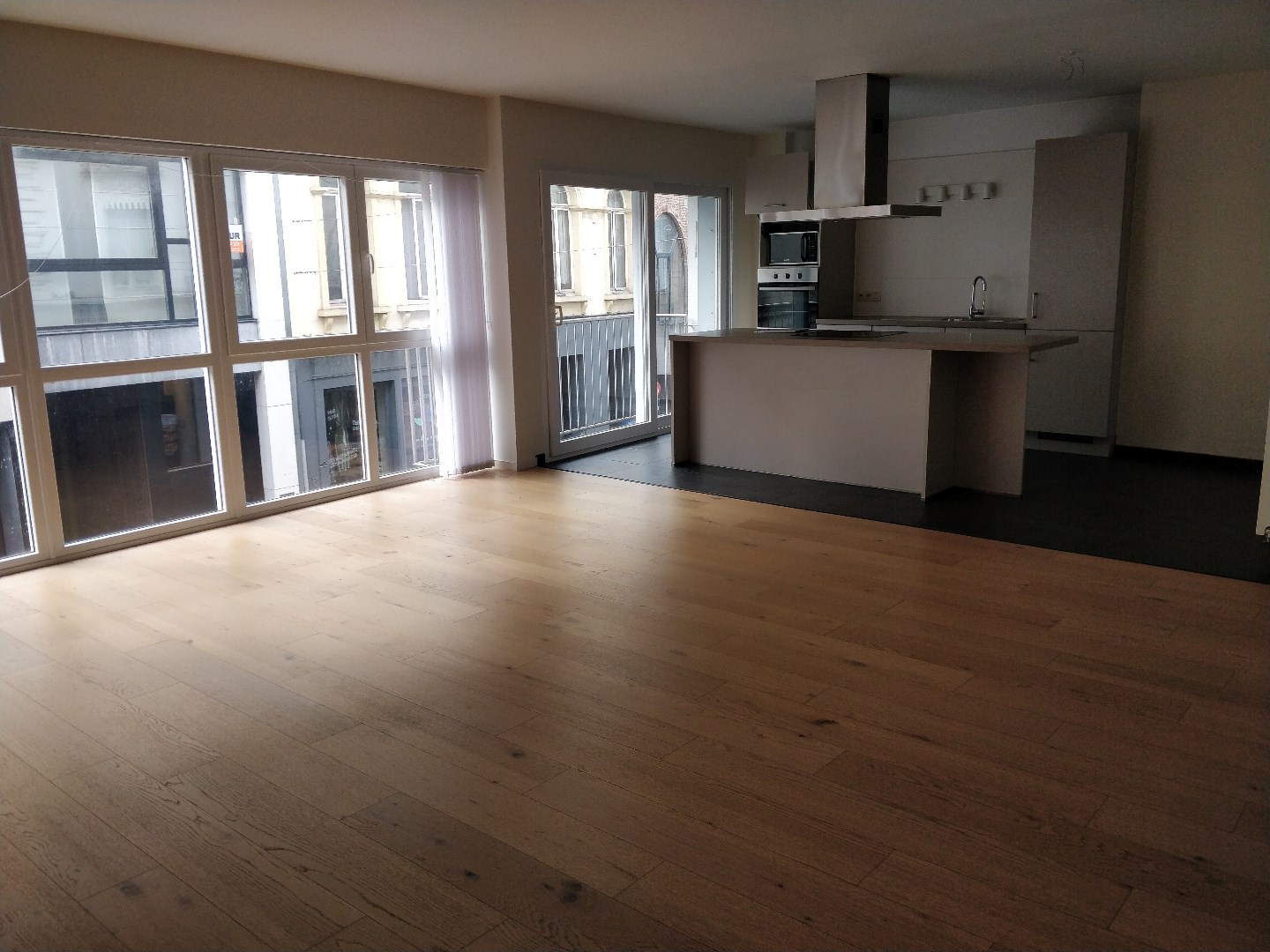 Bij het betreden van het appartement kom je binnen in de living en de open ingerichte keuken.
