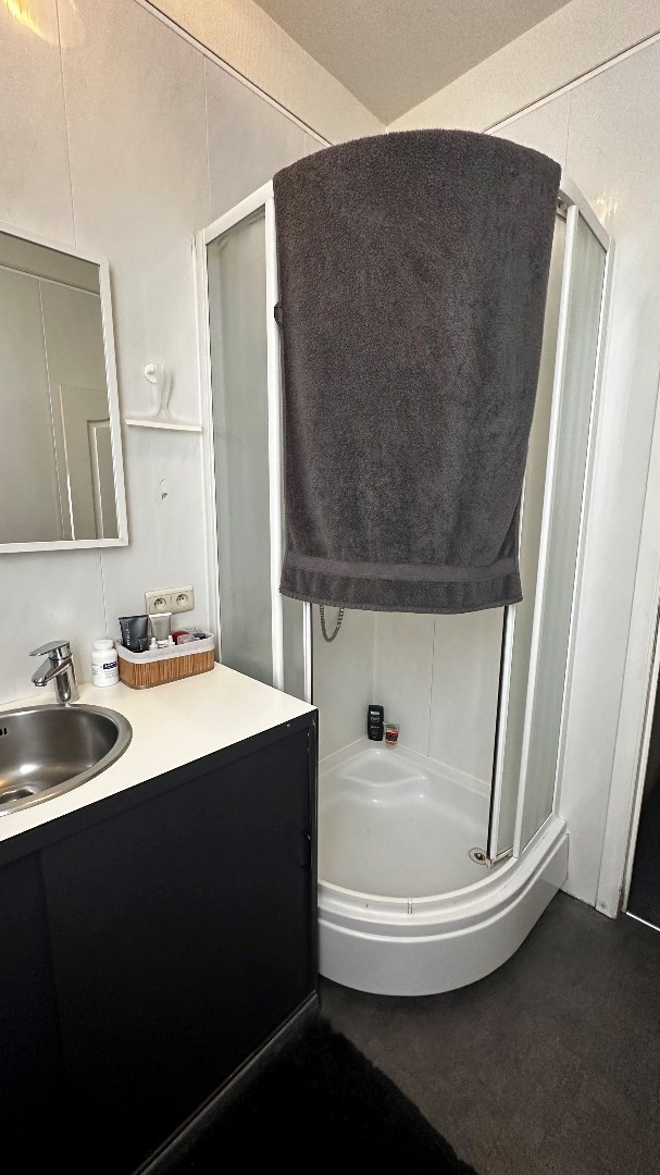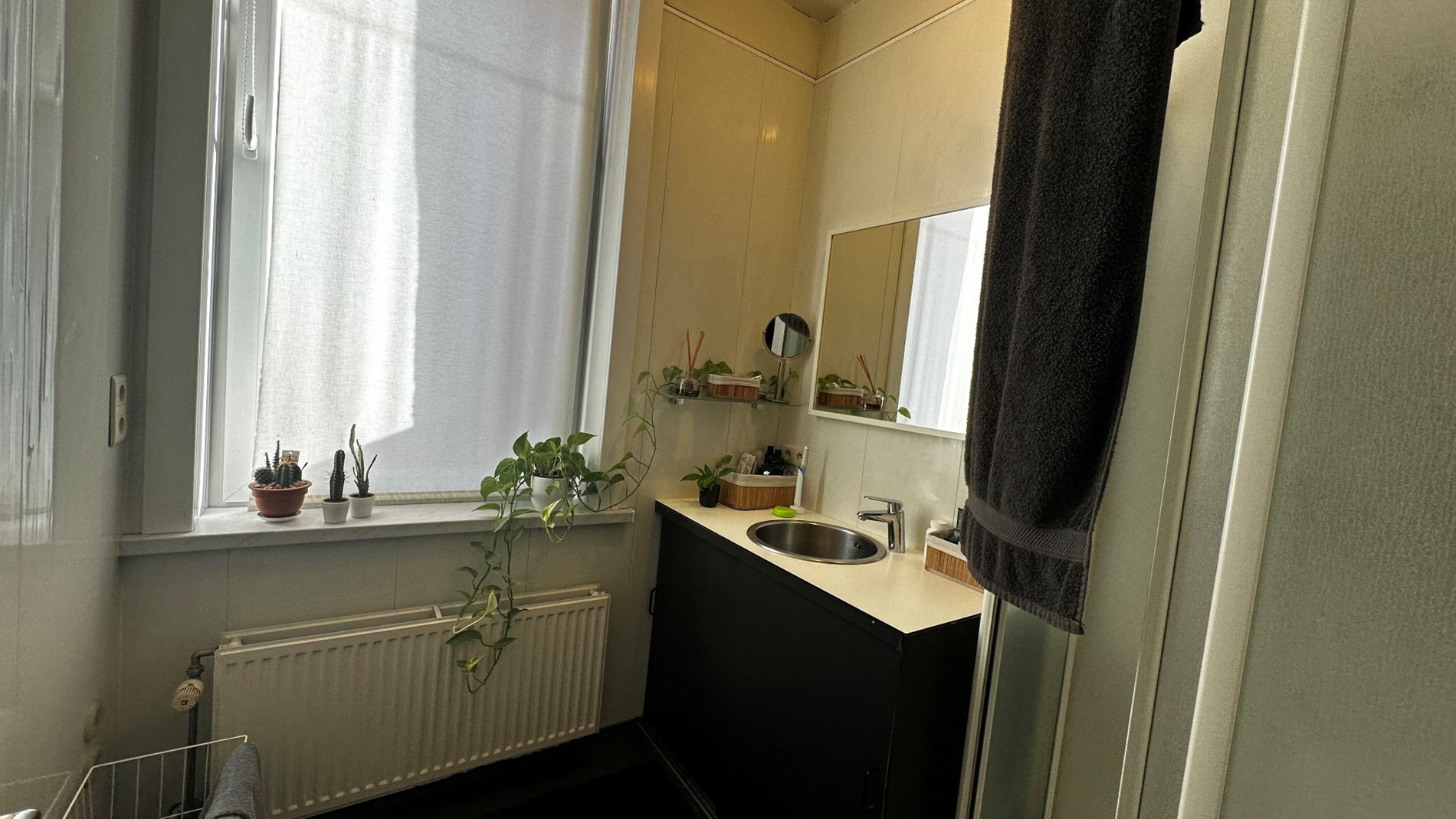 Het appartement heeft één slaapkamer. De ingerichte badkamer is voorzien van een douche en een lavabomeubel. Er is ook een apart toilet aanwezig.