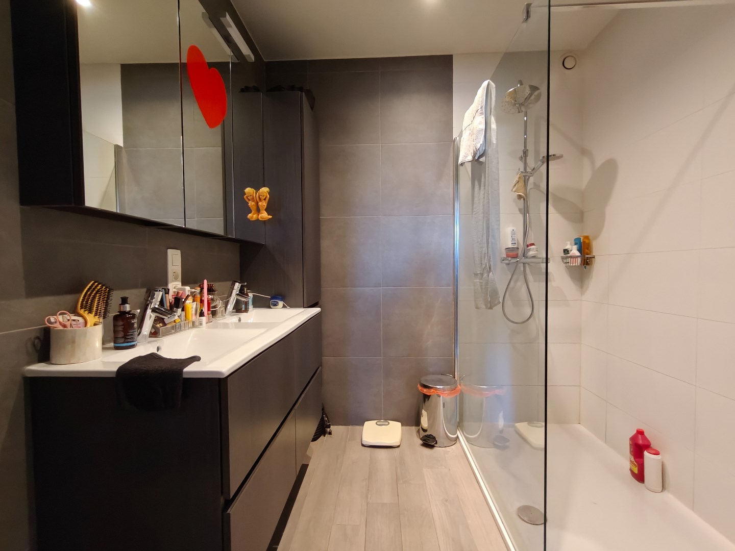 De ruime slaapkamer heeft een aanpalende ingerichte badkamer, uitgerust met een badkamermeubel en een inloopdouche.