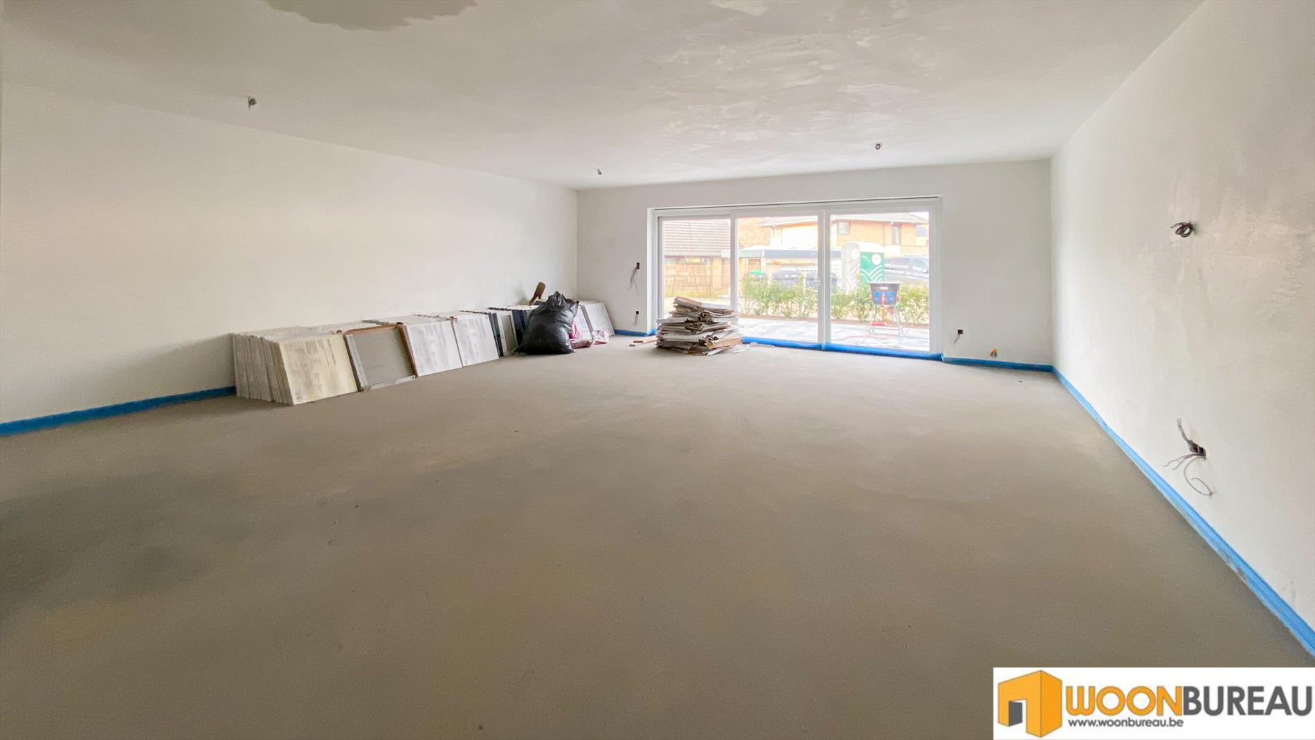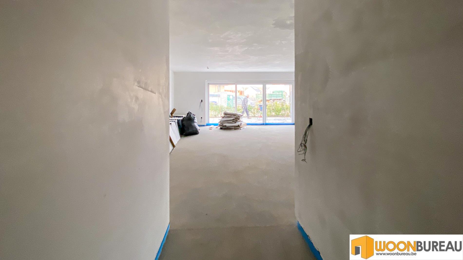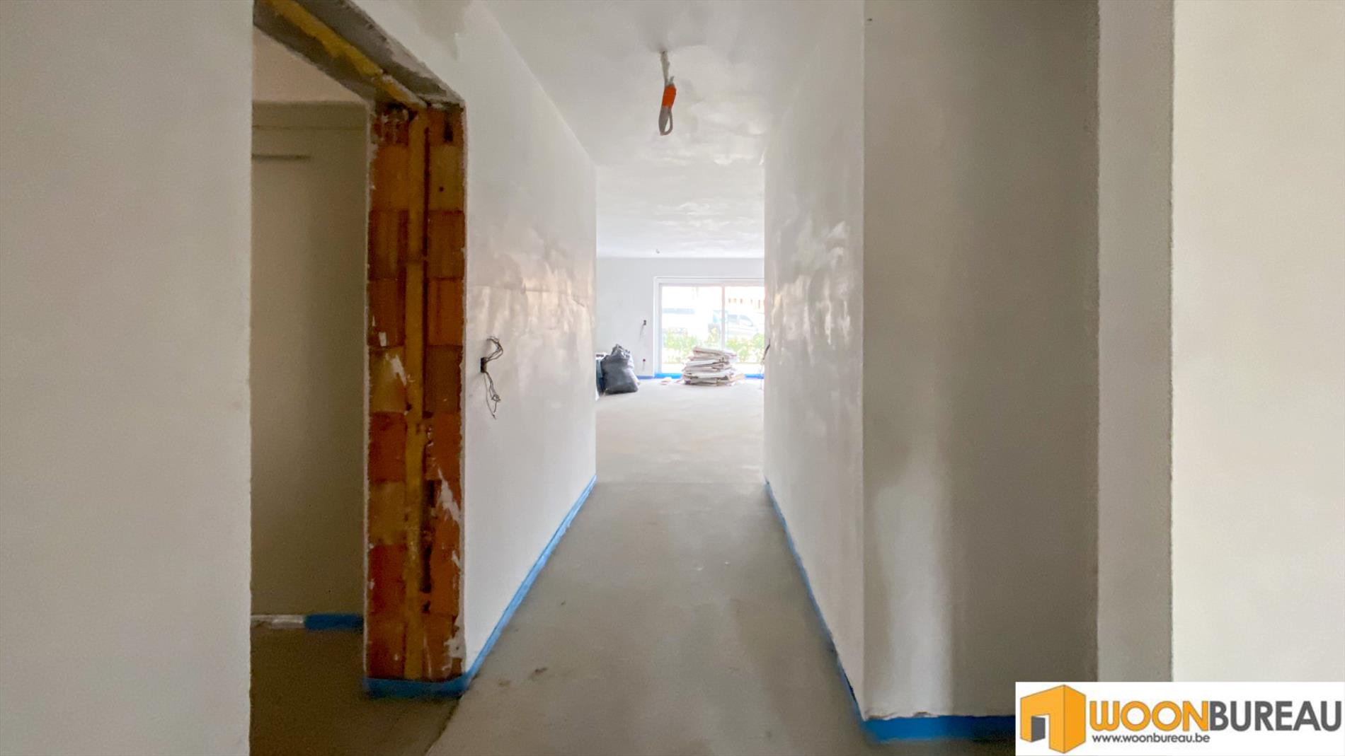 U komt binnen via de gang, deze geeft toegang tot de ruime leefruimte met open keuken met aparte berging. De grote schuifdeuren geven rechtstreeks toegang tot het terras van 31m². Aansluitend op de gang bevinden zich 2 slaapkamers, een badkamer en een apart toilet.