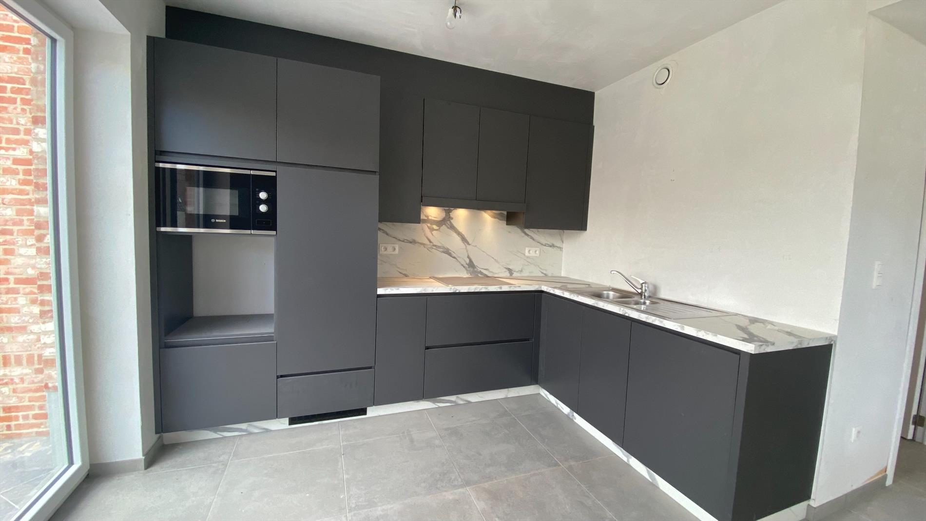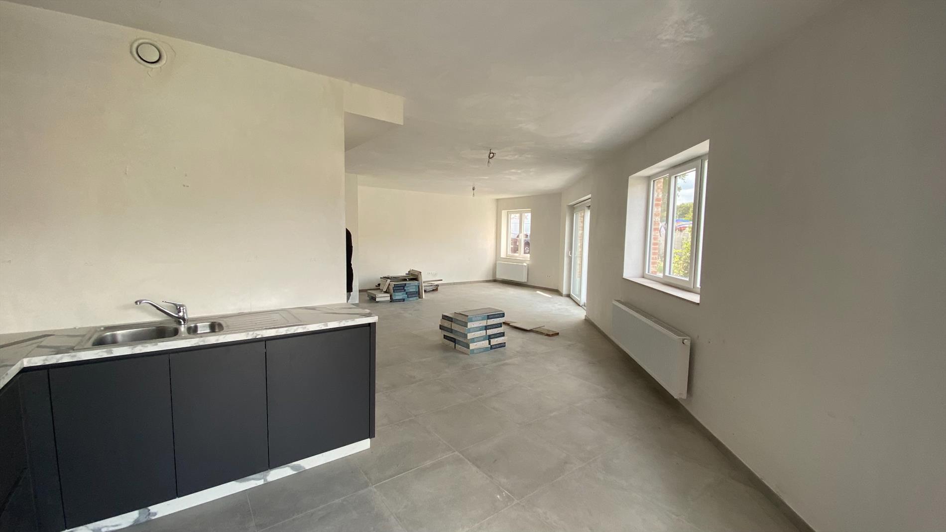 U komt binnen via de gang, deze geeft toegang tot de ruime leefruimte met open keuken met aparte berging. De grote schuifdeuren geven rechtstreeks toegang tot de tuin van 58m². Aansluitend op de gang bevinden zich 2 slaapkamers, een badkamer en een apart toilet.