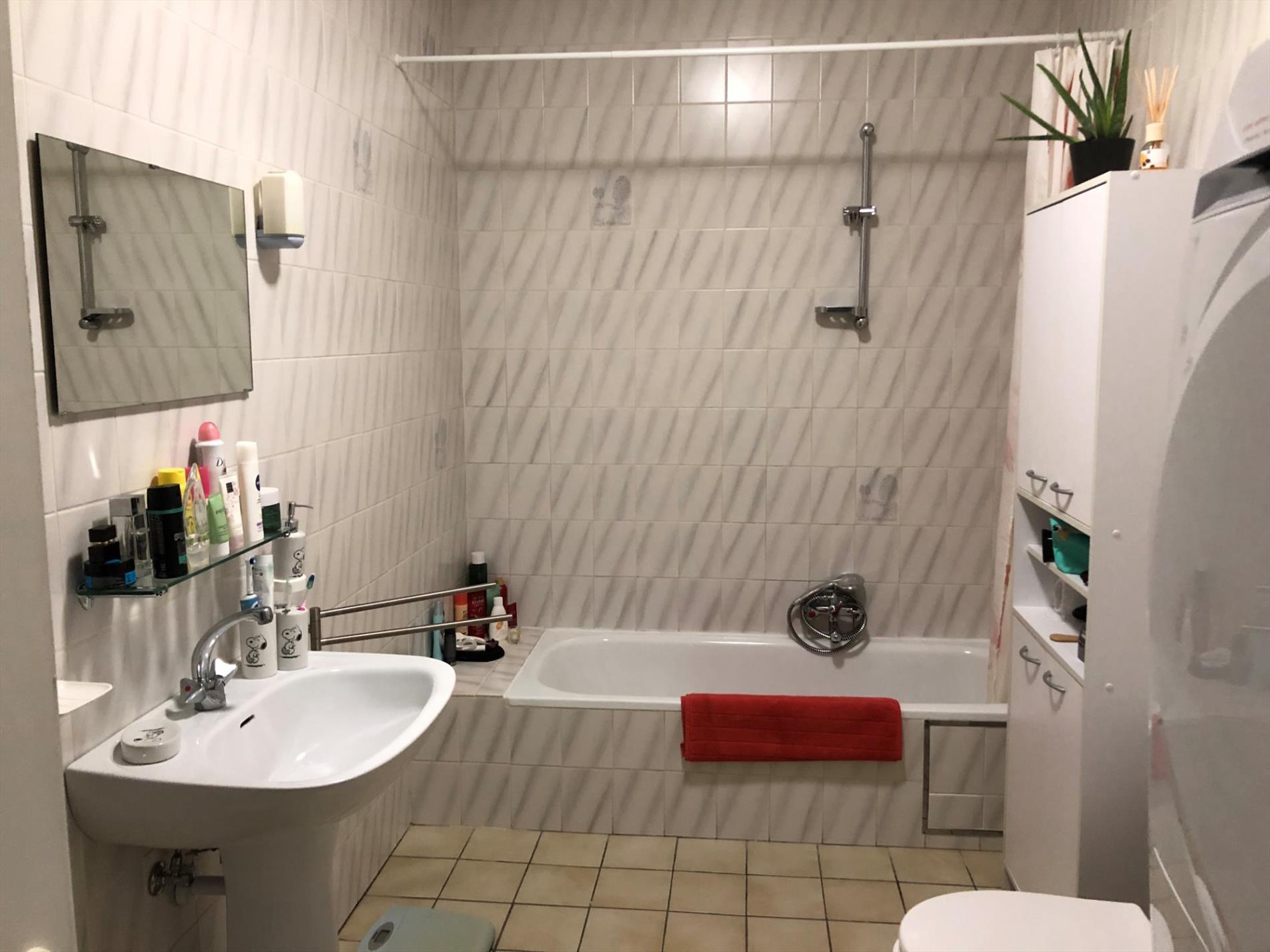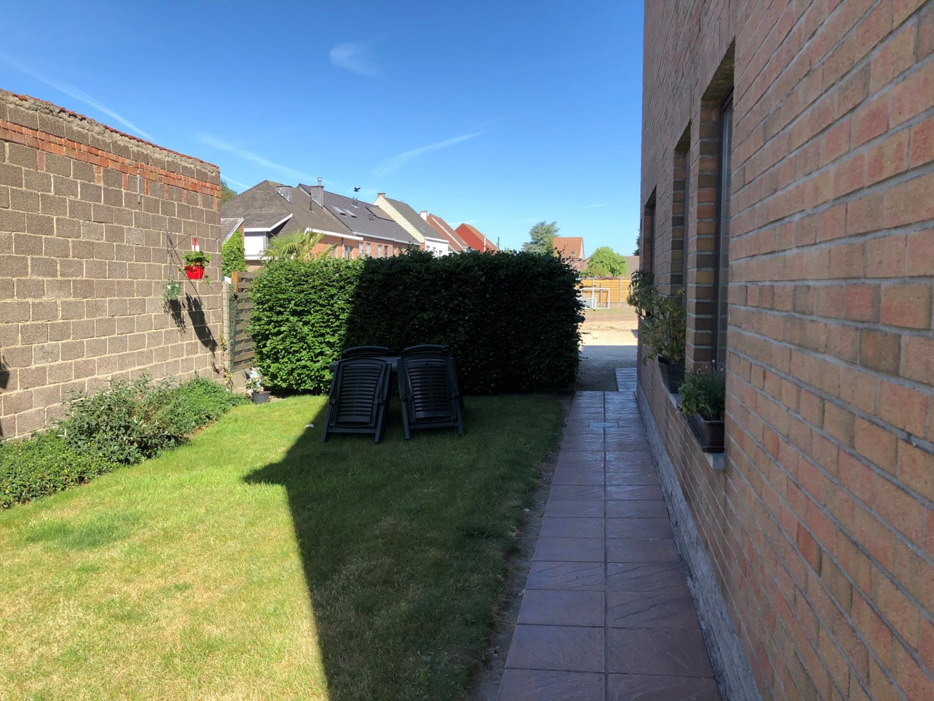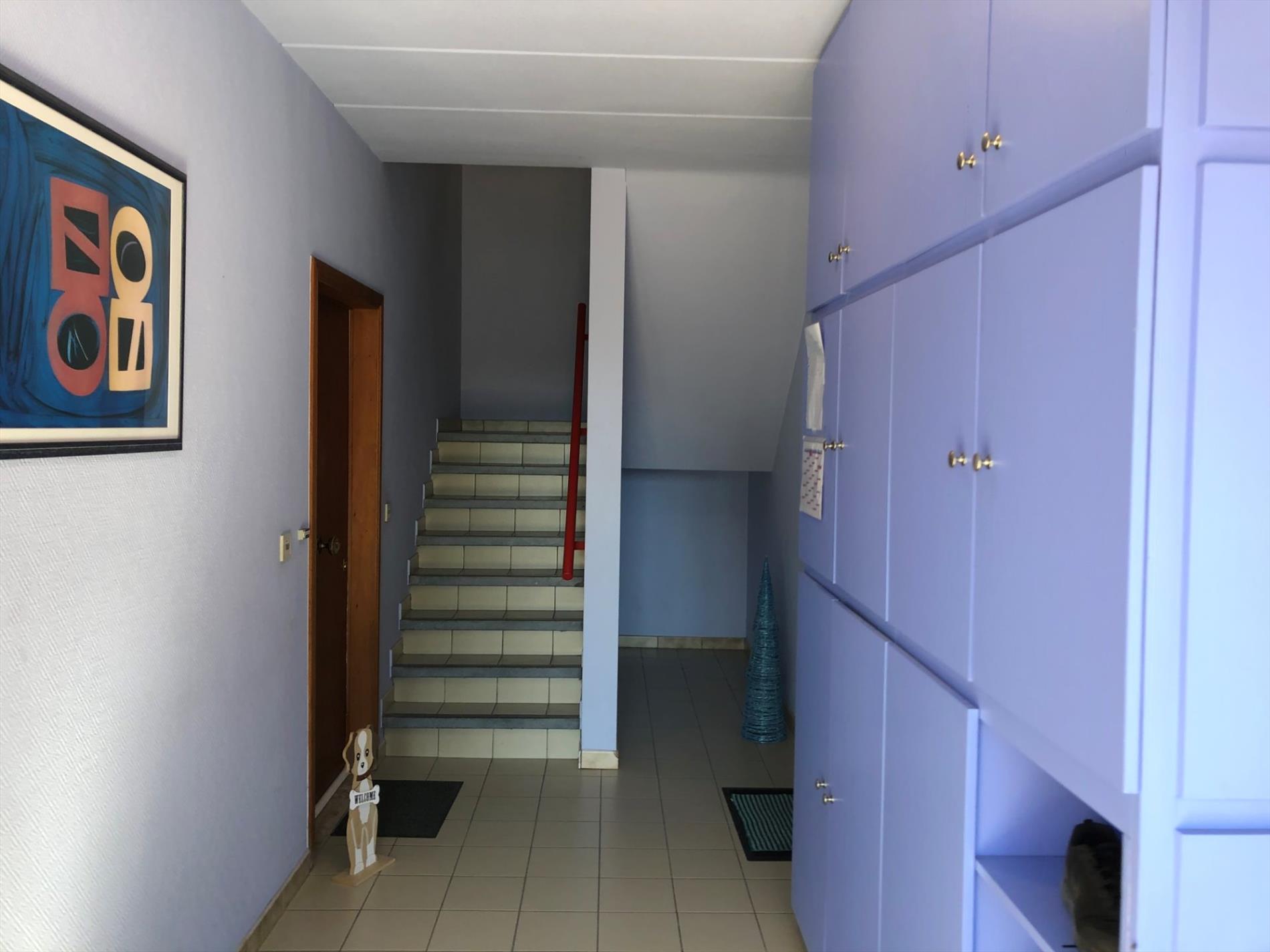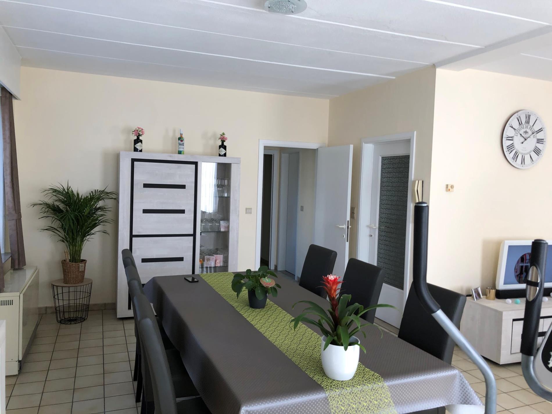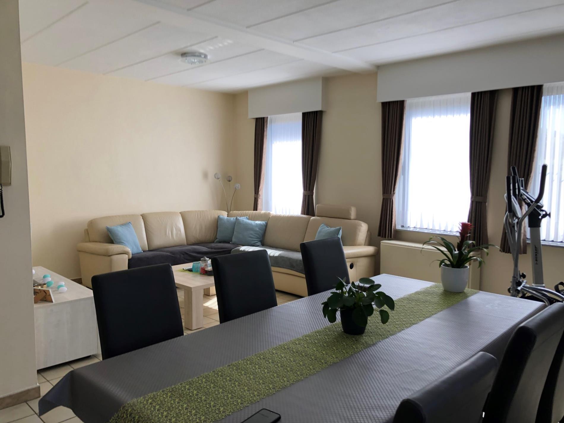 Gelijkvloers appartement omvat: inkom - living - ingerichte keuken met toestellen - ingerichte badkamer - twee slaapkamers - tuin - garage - CV met accumulatie op elektr