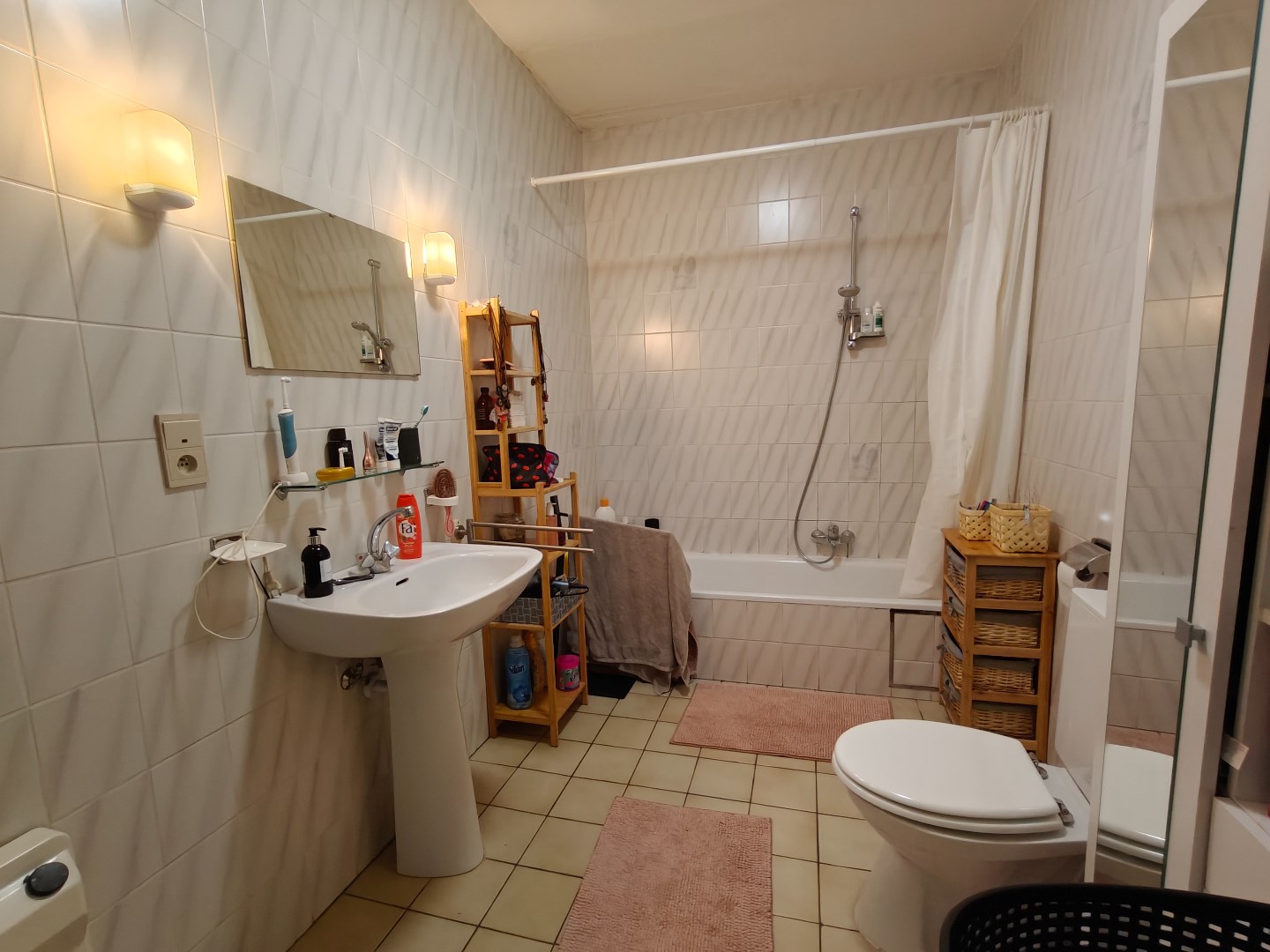 De badkamer is voorzien van een ligbad en lavabomeubel. Daarnaast is er een aparte berging die ideaal is voor het opbergen van huishoudelijke spullen of het plaatsen van een wasmachine en droger.