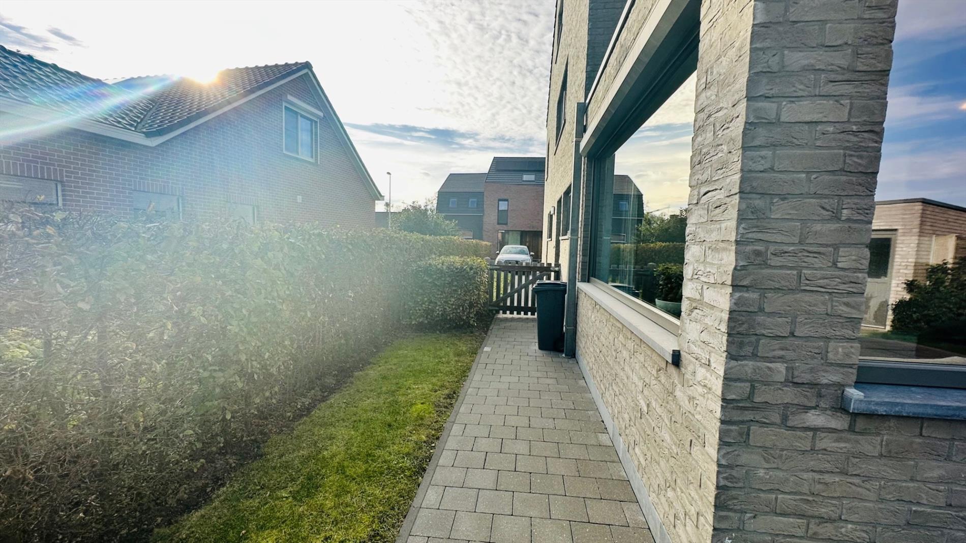Nieuwbouw gelijkvloers appartement te Lokeren, voorzien van inkom met apart toilet - ruime living met grote ramen - ingerichte open keuken - ingerichte badkamer met ligbad en douche - 1 slaapkamer - 1 kamer in te richten als kamer/bureau - berging - zuiders zonnig terras - tuin - garage bereikbaar via tuin.