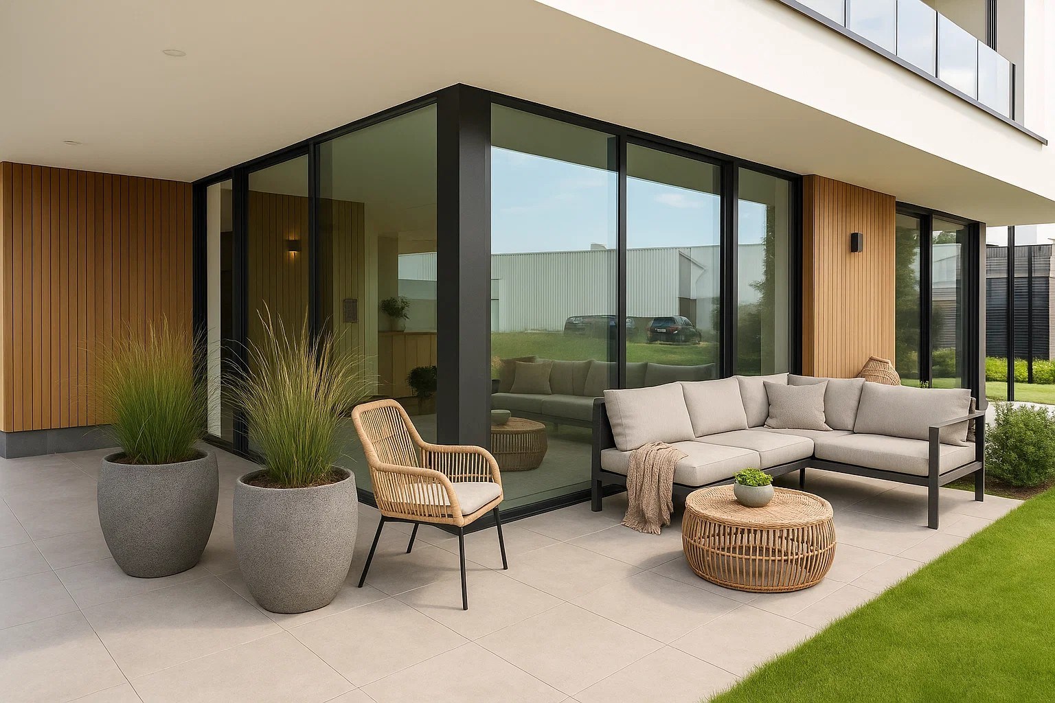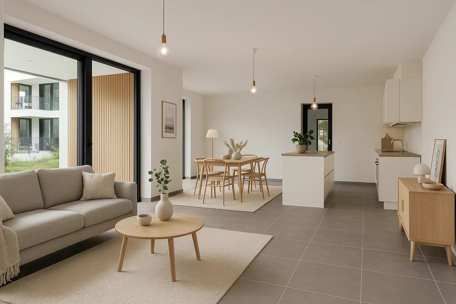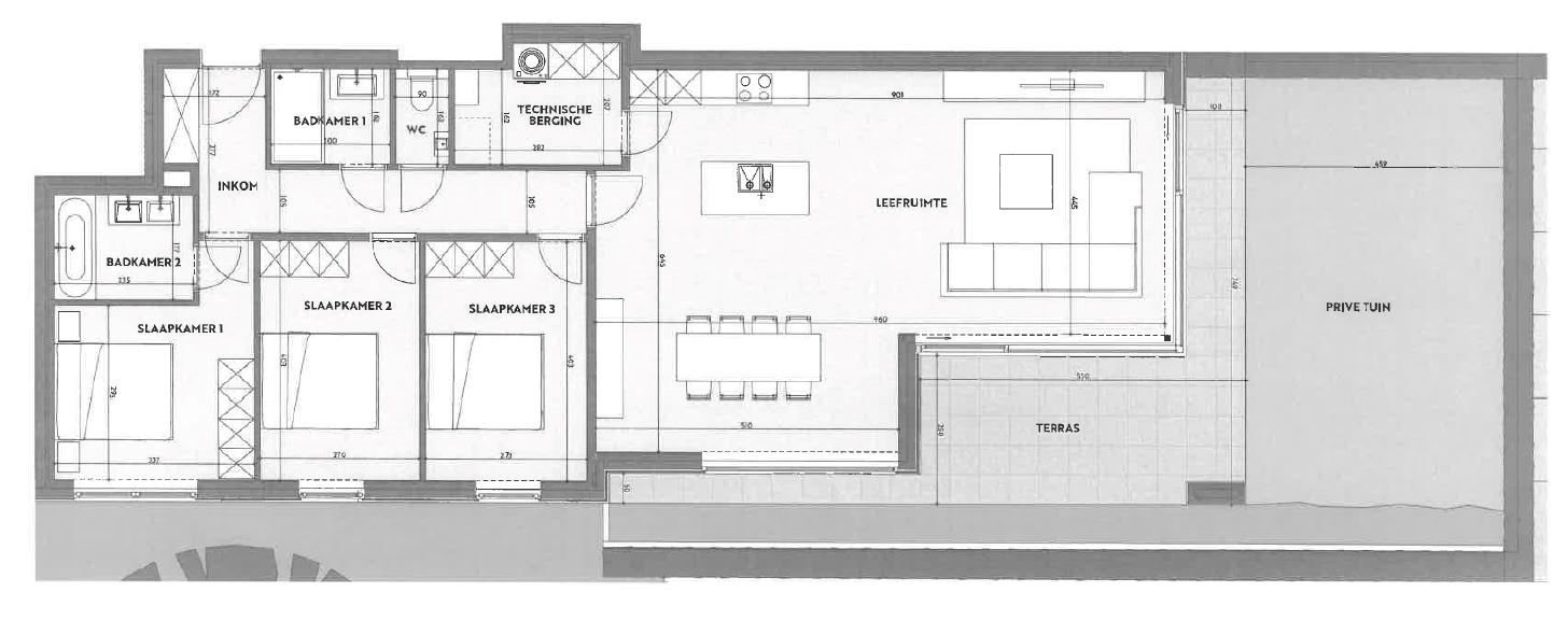 Bij het binnenkomen van het appartement word je verwelkomd in de inkomhal die toegang biedt tot de verschillende ruimtes. Het appartement beschikt over een lichtrijke leefruimte met een open, volledig uitgeruste keuken. De grote raampartijen zorgen voor een mooie overgang naar het terras en de tuin, ideaal om in alle rust van het buitenleven te genieten. Er zijn drie slaapkamers, waarvan de master bedroom voorzien is van een ensuite badkamer met inloopdouche en badkamermeubel. Daarnaast is er een tweede badkamer met inloopdouche en dubbele wastafel, een aparte berging met aansluitingen voor wasmachine en droogkast, en een gastentoilet dat aangesloten is op regenwater.
