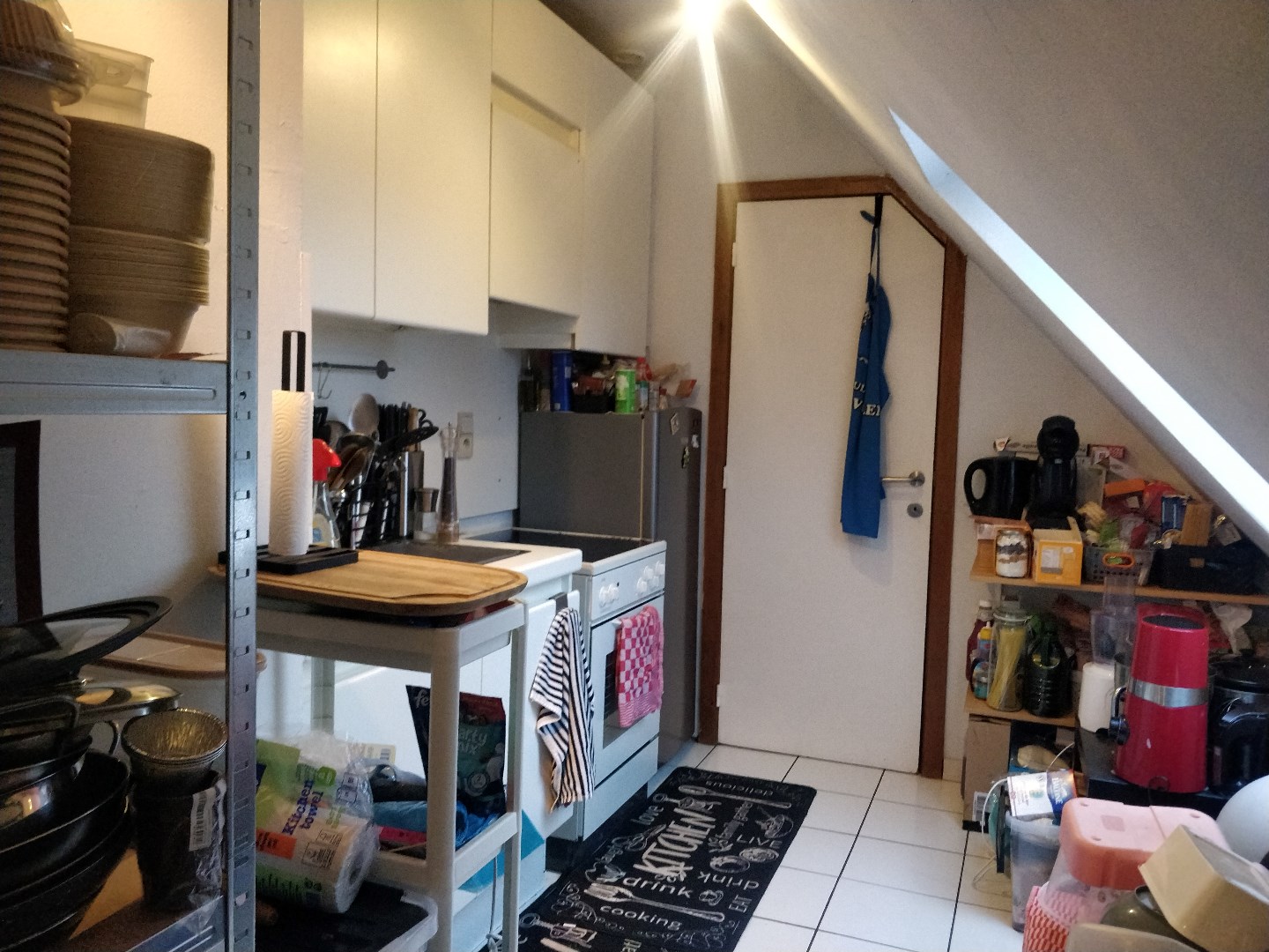 Bij het betreden van het dakappartement tref je de inkom die leidt naar de woonkamer en ingerichte keuken. De keuken is voorzien van een aanpalende berging voor extra opbergruimte.