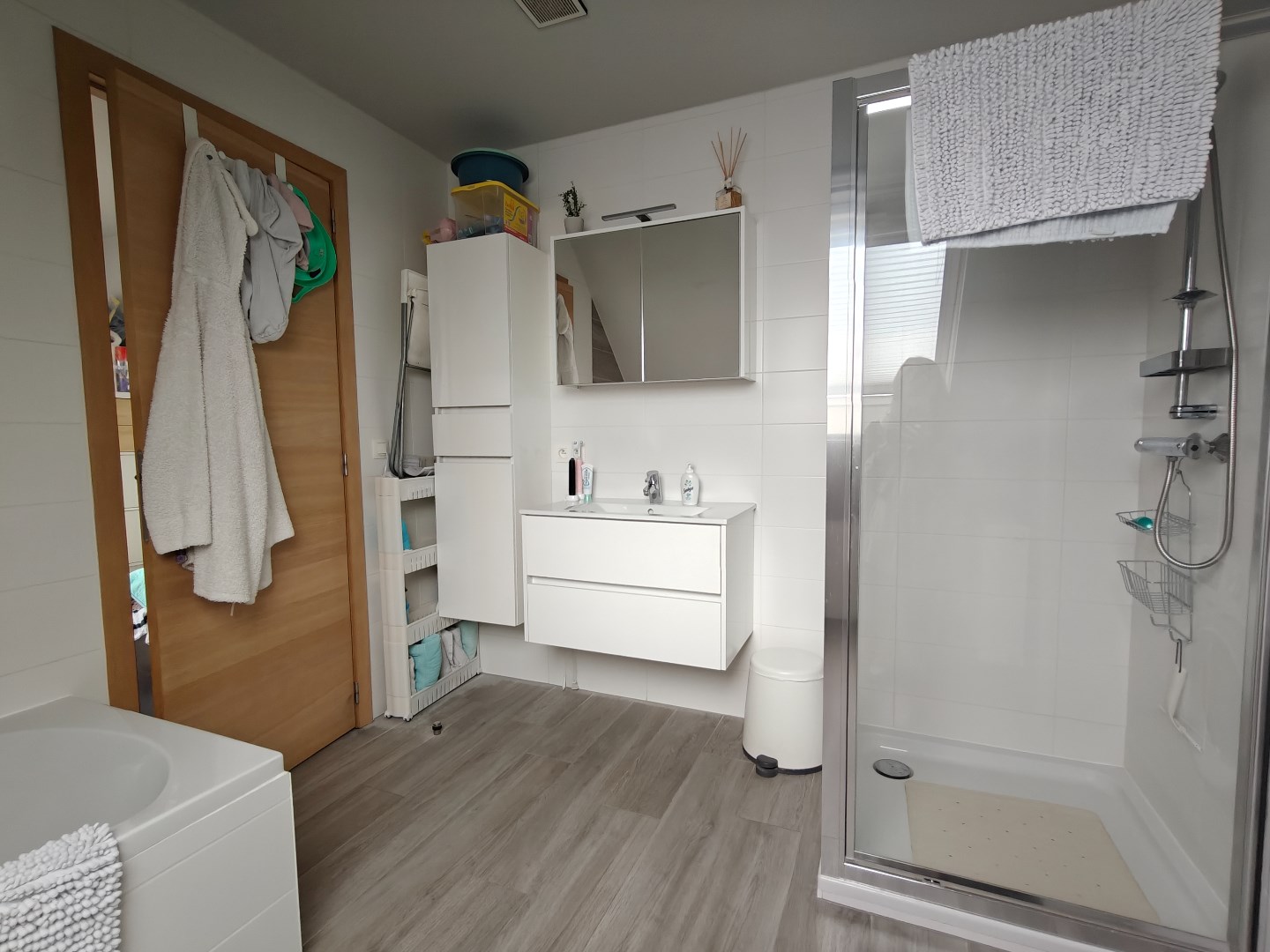 Het appartement is voorzien van twee slaapkamers. De badkamer is uitgerust met een ligbad, een douche en een badkamermeubel. Daarnaast beschikt het appartement over twee afzonderlijke toiletten, één op elk niveau. Een aparte berging biedt bovendien voldoende ruimte voor wasmachine, droogkast en andere huishoudelijke benodigdheden.