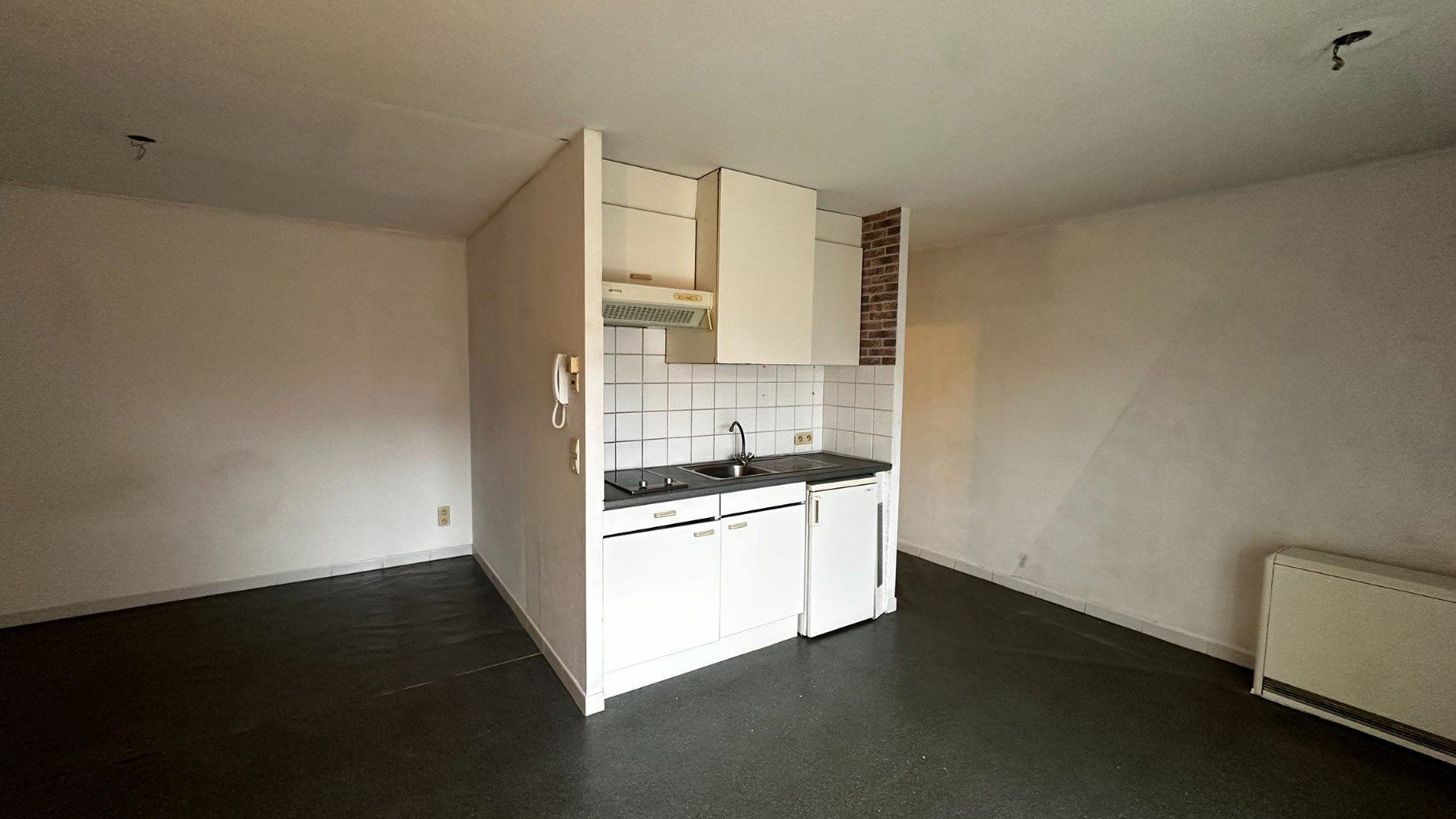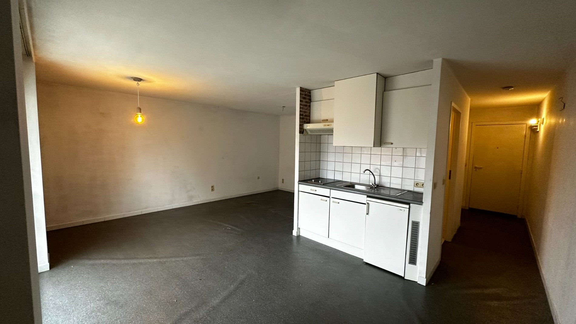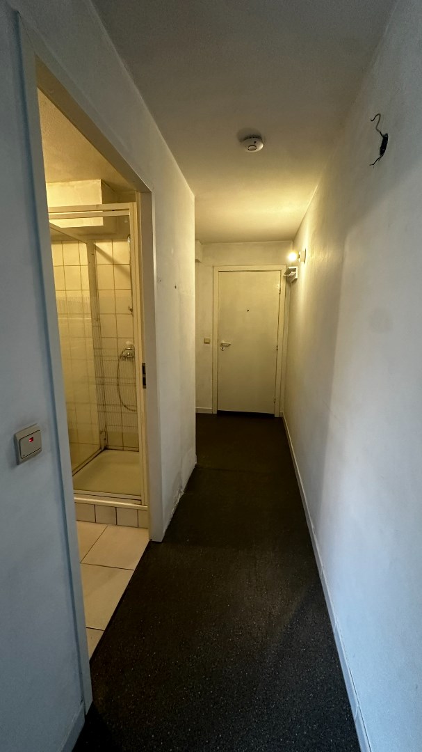 Deze studio is gelegen op de tweede verdieping. Bij het betreden van de studio kom je binnen in de inkomhal, die toegang biedt tot de leef- en slaapruimte.