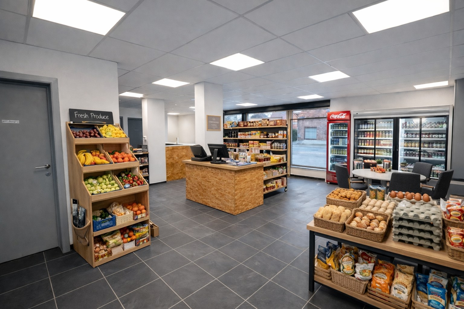 Het pand omvat een ruime handelsruimte met toonbank, een ingerichte keuken, een afzonderlijk bureau, praktische berging en een open afgewerkte zolderruimte die extra mogelijkheden biedt.