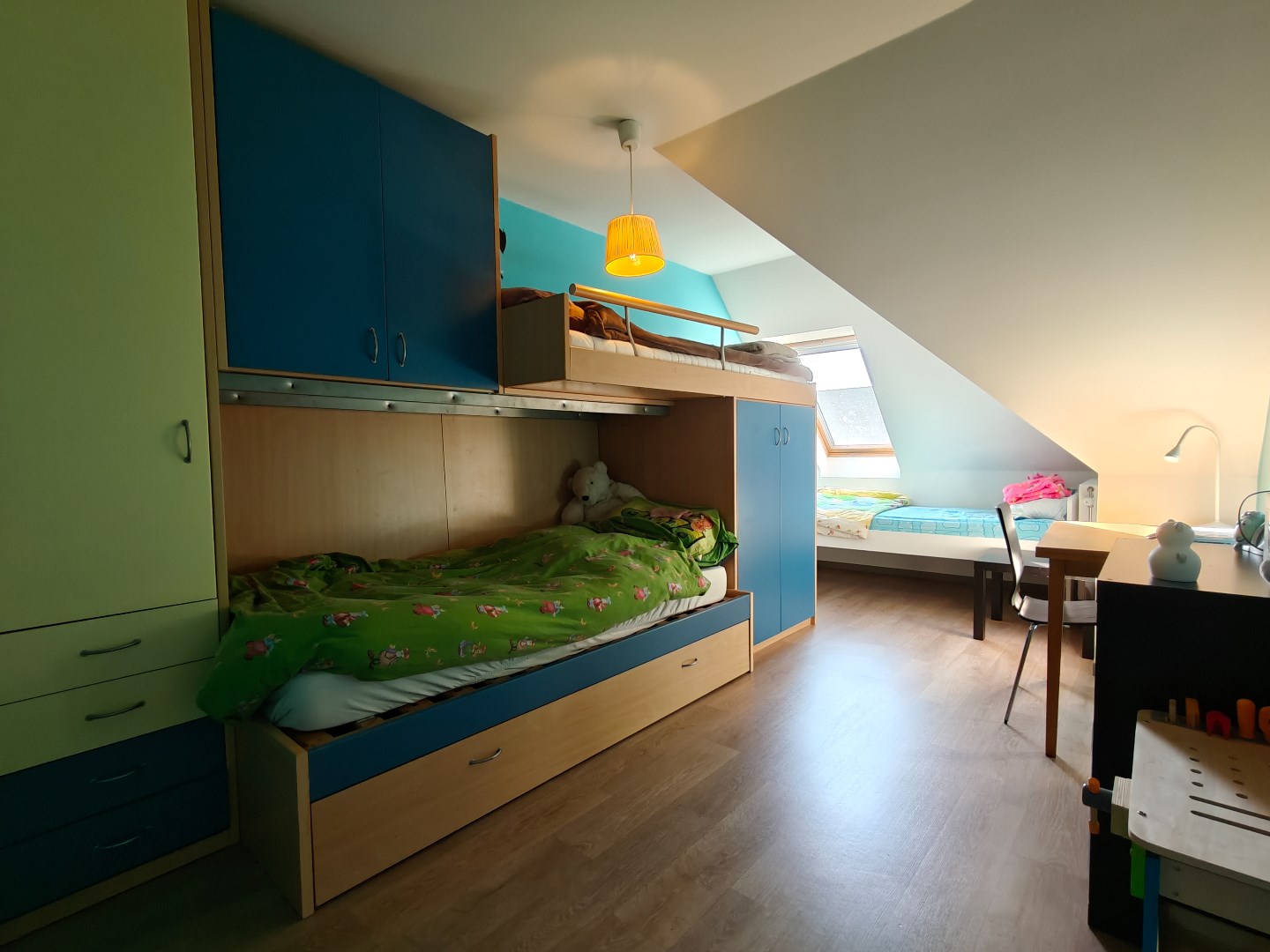 Op de bovenverdieping bevinden zich drie slaapkamers, een badkamer met ligbad, douche en toilet. Tot slot is er een geïsoleerde, ruime zolder die extra bergruimte biedt of mogelijks andere functies kan vervullen.
