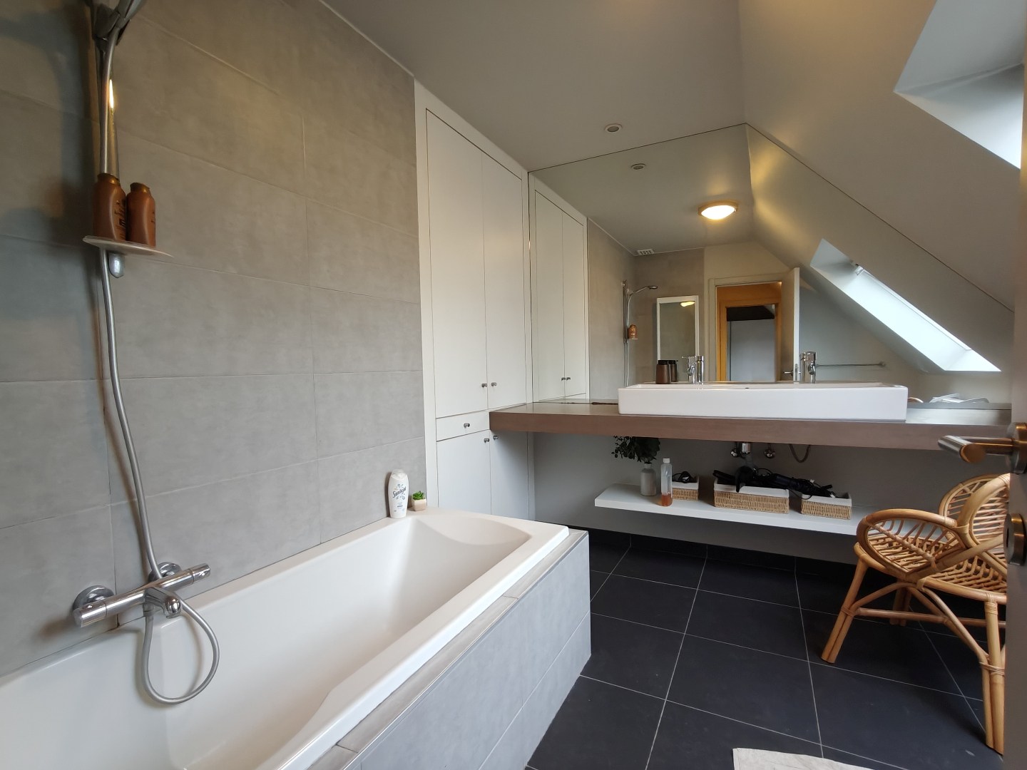 De woning beschikt over drie slaapkamers, waarvan twee uitgerust zijn met airconditioning. De ingerichte badkamer is voorzien van een ligbad. Op de overloop zijn bovendien ingemaakte kasten aanwezig, wat zorgt voor extra opbergruimte. Verder is er een geïsoleerde zolder, perfect als bijkomende bergruimte.