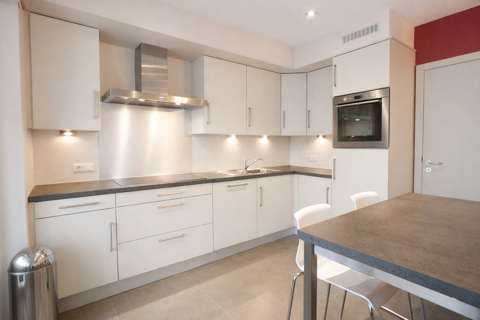 Je komt binnen via de inkomhal met vestiaire en wordt meteen geleid naar de lichtrijke leefruimte waar het aangenaam vertoeven is. De open, volledig uitgeruste keuken sluit hier naadloos op aan en beschikt bovendien over een praktische en-suite berging.