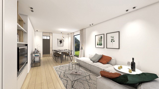 Je komt binnen via een ruime inkomhal met apart gastentoilet. De lichtrijke leefruimte sluit mooi aan op de open keuken, perfect voor gezellige familiemomenten. Aansluitend is er een praktische berging/garage.