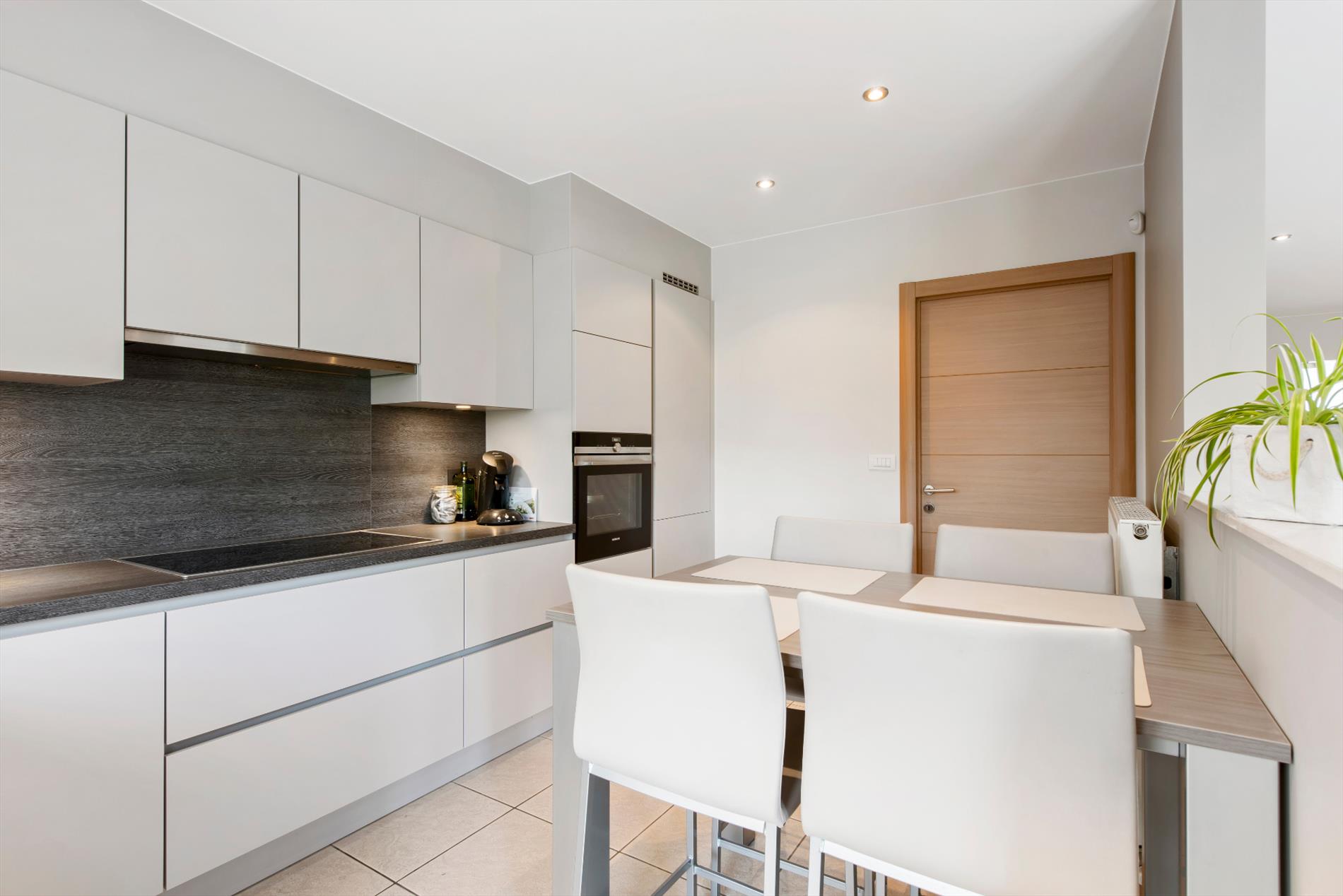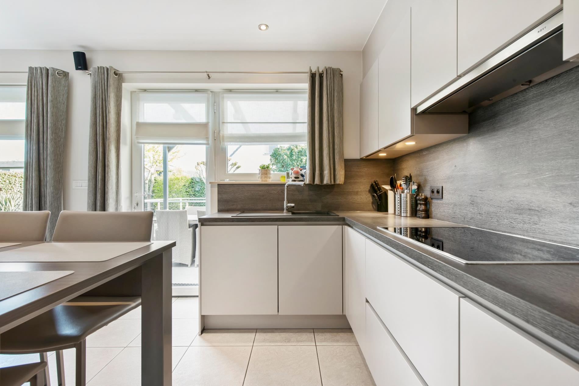 De recent vernieuwde ingerichte open keuken, welke is afgewerkt met hoogwaardige materialen, kijkt net als de eetruimte uit op de tuin.